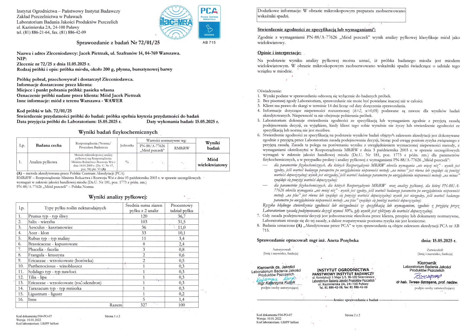 Instytut Ogrodnictwa – Państwowy Instytut Badawczy Zakład Pszczelnictwa w Puławach Laboratorium Badania Jakości Produktów Pszczelich ul. Sosnowa 3, 24-100 Puławy Zobacz badania miodu